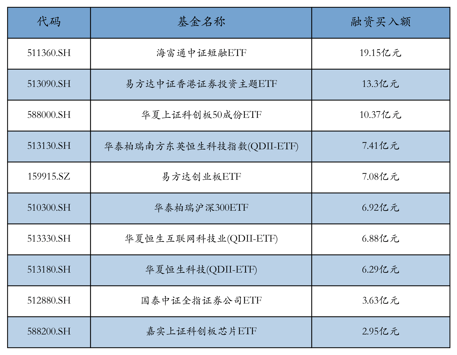 12月12日ETF融资买入额前三位分别为:海富通中证短融ETF(19.15亿元)、易方达中证香港证券投资主题ETF(13.3亿元)和华夏上证科创板50成份ETF(10.37亿元),前10具体见下表: