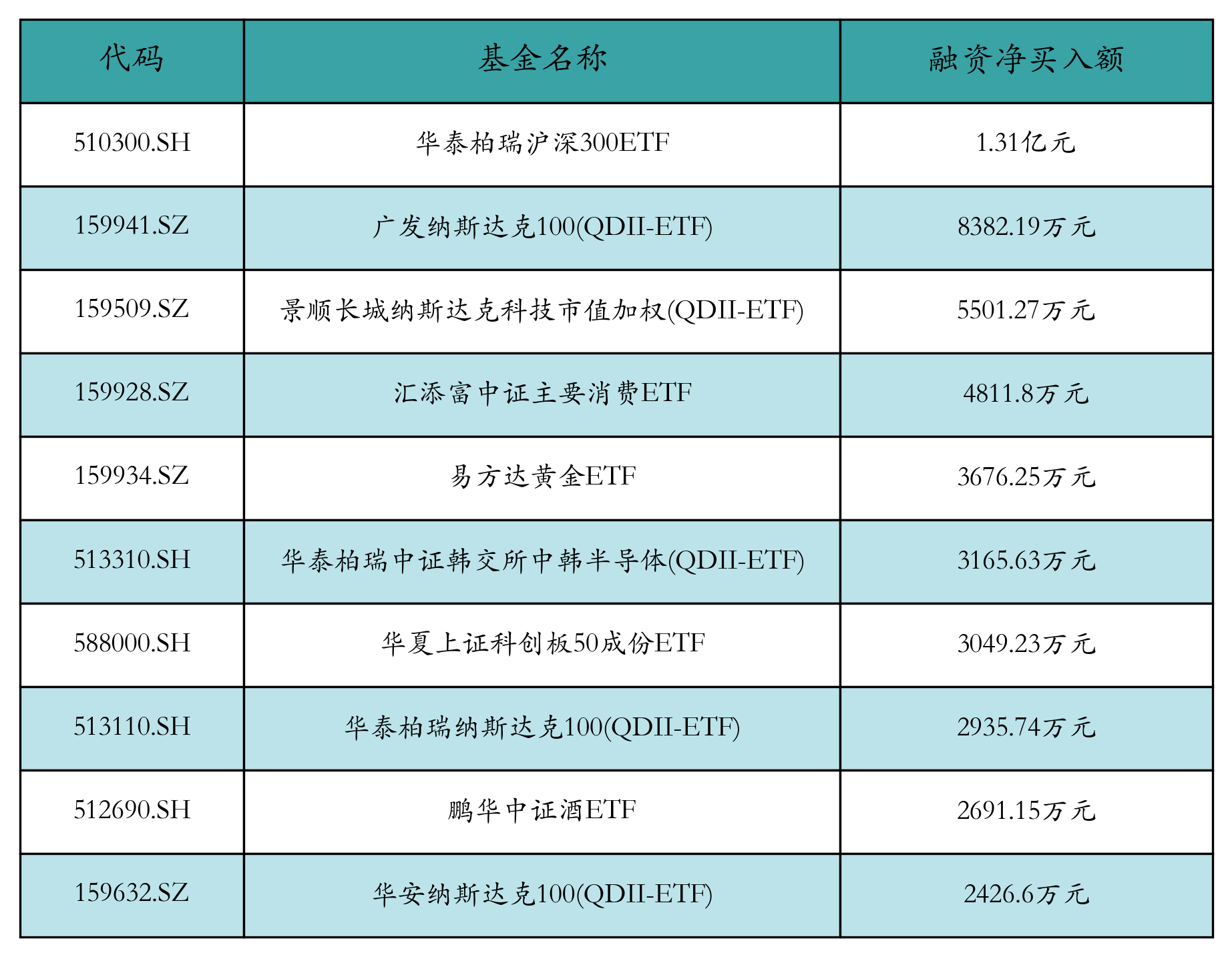 12月12日ETF融资净买入额前三位分别为:华泰柏瑞沪深300ETF(1.31亿元)、广发纳斯达克100(QDII-ETF)(8382.19万元)和景顺长城纳斯达克科技市值加权(QDII-ETF)(5501.27万元),前10具体见下表: