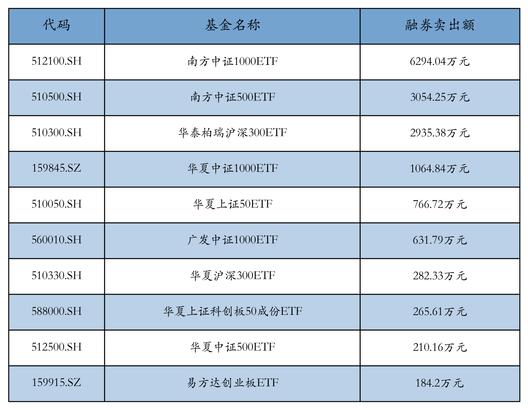 12月12日ETF融券卖出额前三位分别为:南方中证1000ETF(6294.04万元)、南方中证500ETF(3054.25万元)和华泰柏瑞沪深300ETF(2935.38万元),前10具体见下表: