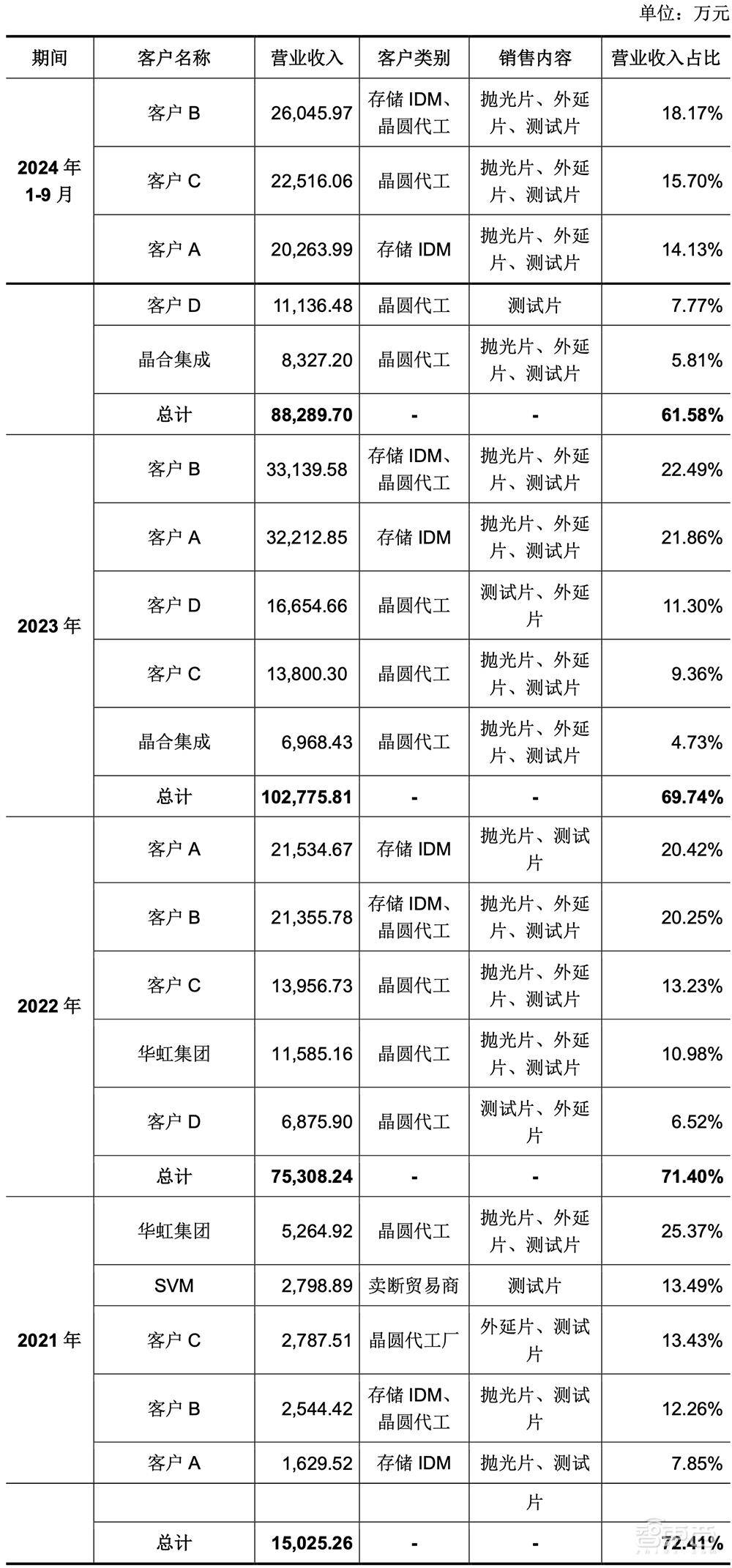 报告期内,西安奕材前五大客户以中国大陆晶圆代工厂商和存储IDM 厂商为主,均为直销,2022年开始全球最大的晶圆代工厂商客户D也进入前五大客户。其前五大客户营业收入占比始终在60%以上。
