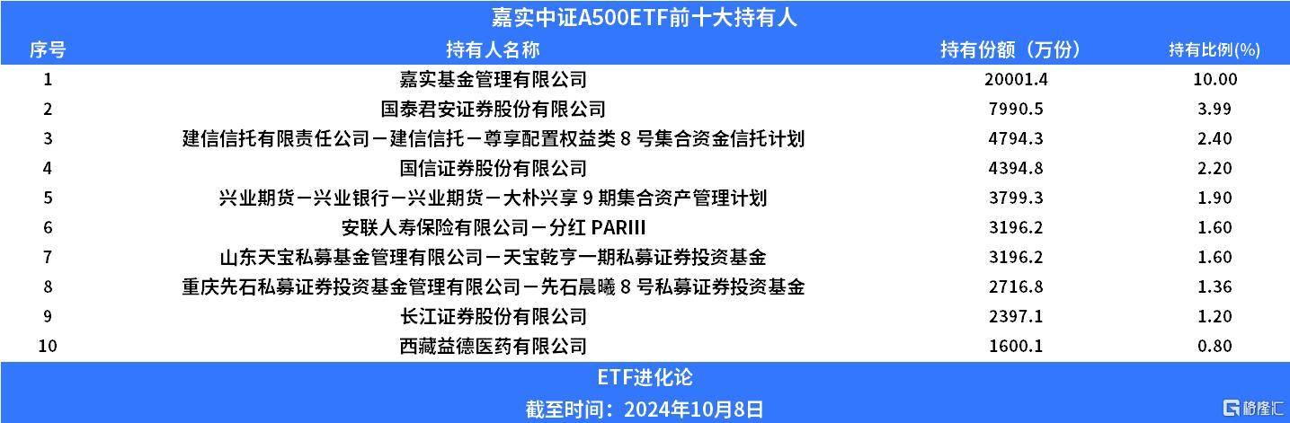 从前十大持有人名单来看,券商、私募、信托、期货公司、外资银行等众多机构投资者出现在中证A500ETF的前十名持有人名单中。