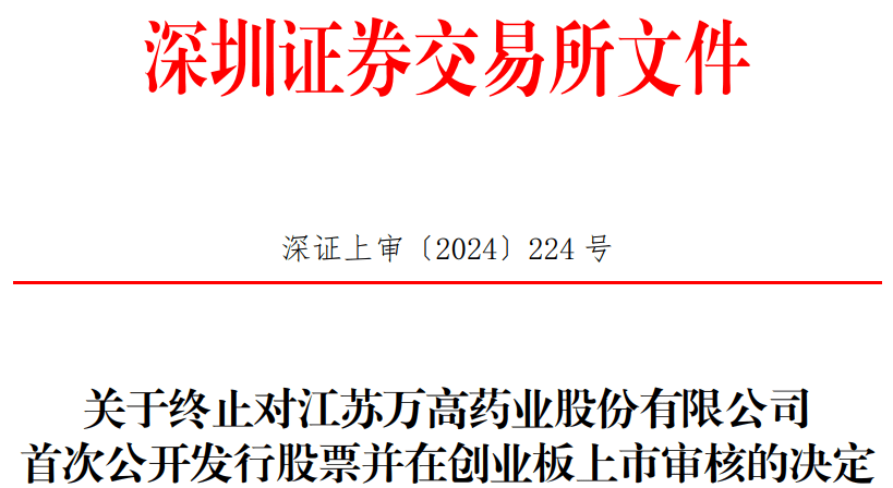 深交所网站7月30日公布关于终止对江苏万高药业股份有限公司(简称“万高药业”)首次公开发行股票并在创业板上市审核的决定。