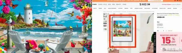 (图:艾伦·吉安娜的作品《Coastal Escape》与SHEIN官网出售画作截图)