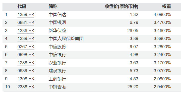 恒生港股通中国央企红利指数前十大权重的累计占比为33.09%,主要集中在金融行业,单只个股的权重占比也都低于5%。