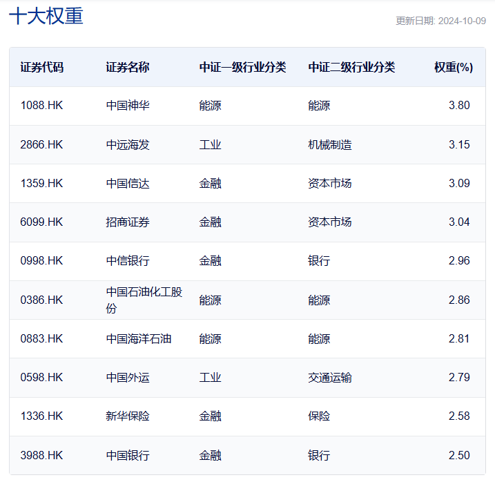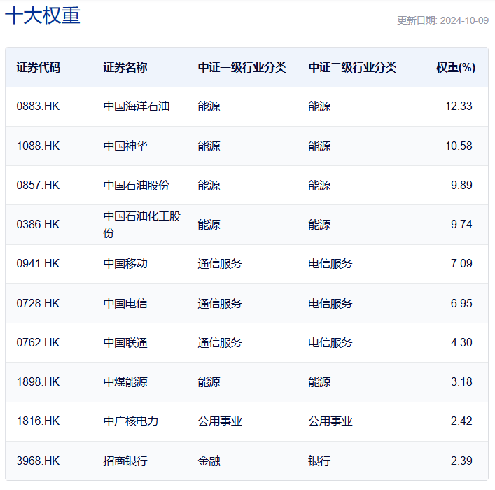 中证港股通央企红利指数前十大权重的累计占比为29.56%,主要集中在能源、金融行业,单只个股的权重占比均低于5%。