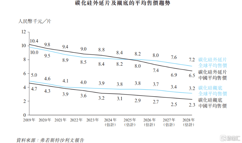 同时,公司在招股书中表示,2025年后中国碳化硅外延片平均售价的下降速度将快于全球平均售价的下降速度。中国碳化硅外延片每片平均售价于2021年约为9400元,并预计于2028年前大幅下降至6500元。