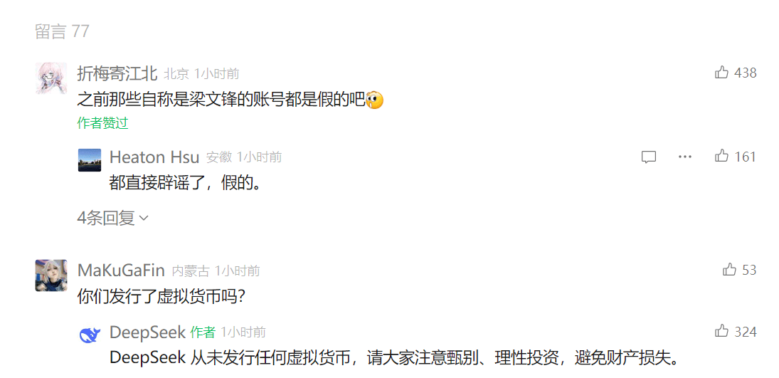 值得注意的是,DeepSeek还在相关文章评论区回应称,从未发行任何虚拟货币,请大家注意甄别、理性投资,避免财产损失。