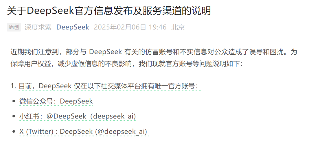 2月6日,DeepSeek针对近期出现的仿冒账号和不实信息发布官方声明,以保护用户权益并减少虚假信息的不良影响。