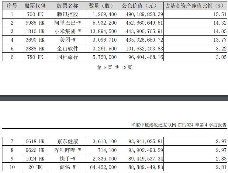 值得注意的是,港股互联网ETF(513770)2024年4季报显示,截至2024年末,港股互联网ETF(513770)前十大权重股分别为腾讯控股、阿里巴巴、小米集团、美团、金山软件、同程旅行、京东健康、哔哩哔哩、快手、商汤等互联网各细分赛道龙头公司,合计权重达75.5%,重仓港股互联网龙头。
