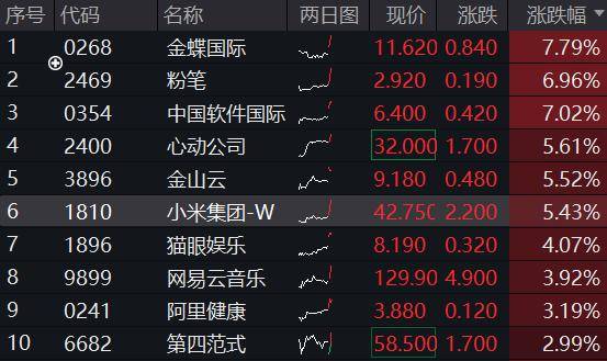 隔夜中概股迎来普涨,纳斯达克中国金龙指数大涨2.69%。今早(2月7日)港股三大指数低开后集体上行,科网龙头表现不俗,小米集团盘中涨逾5%,再创历史新高;快手、哔哩哔哩均涨逾1%。此外,中国软件国际涨近8%,金蝶国际、粉笔、金山云等涨幅居前。