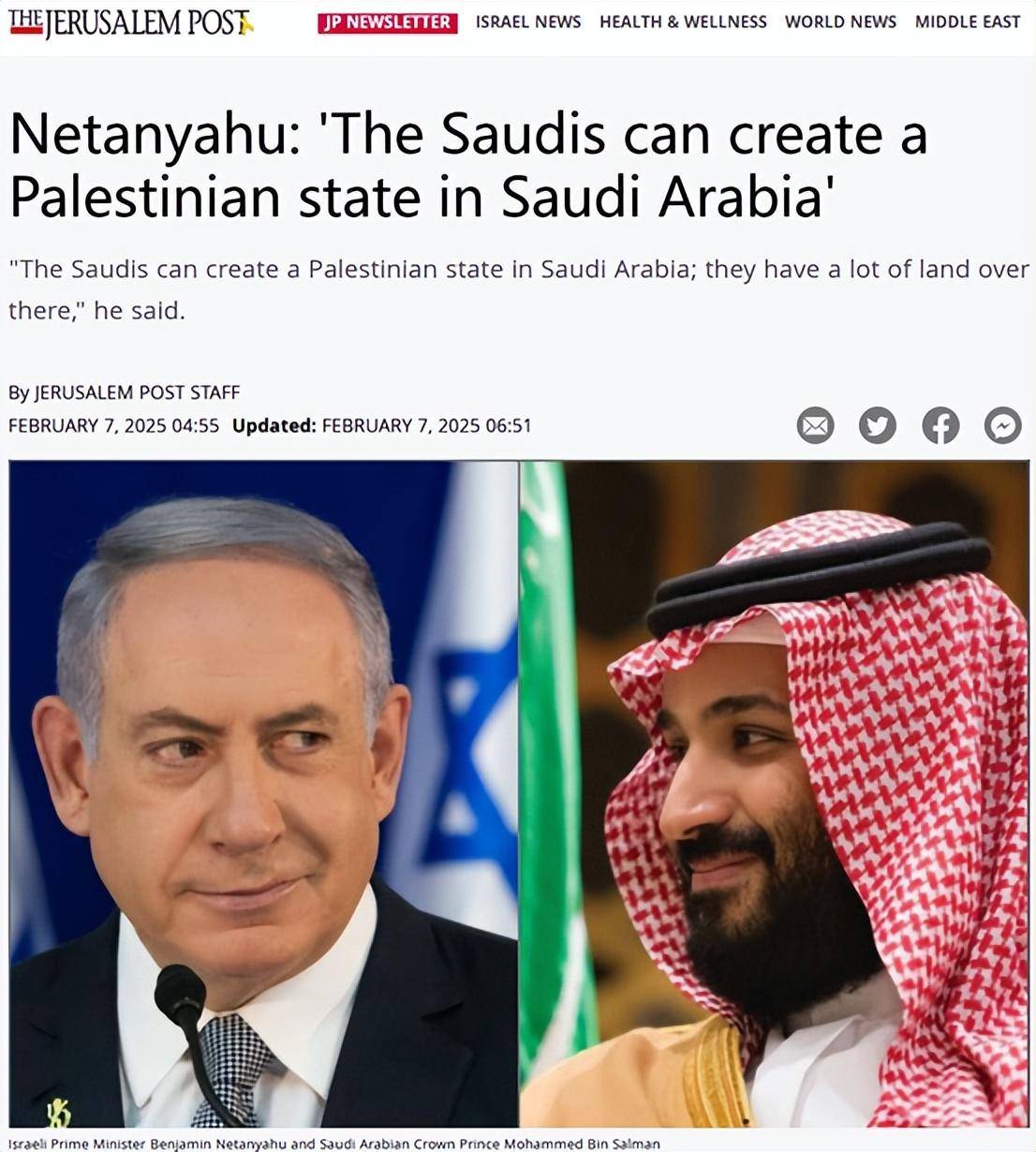 据以色列《耶路撒冷邮报》7日报道,以色列总理内塔尼亚胡提出,中东国家沙特阿拉伯的国土面积很大,巴勒斯坦可以在沙特领土上建国。