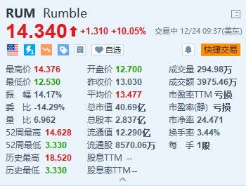 Rumble(RUM.US)续涨超10%,报14.34美元。该股昨日已暴涨超81%,盘中最高触及14.628美元创逾两年新高。消息面上,Rumble宣布已与泰达币达成7.75亿美元的战略投资的最终协议。泰达币是数字资产行业最大的公司,也是全球使用最广泛的美元稳定币,拥有超过35000万用户。(格隆汇)