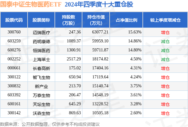 国泰中证生物医药ETF为指数型-股票基金,根据最新一期基金季报显示,该基金资产配置:股票占净值比99.79%,无债券类资产,现金占净值比0.31%。基金十大重仓股如下: