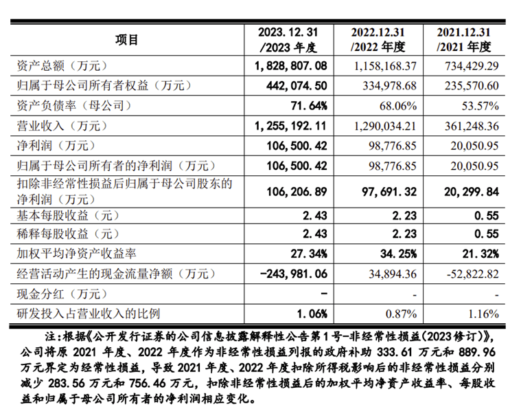 招股书显示,2021-2023年,美科股份实现营收分别为36.12亿元、129.00亿元和125.52亿元,2022年营收为2021年营收的3.57倍;净利润分别为2.01亿元、9.88亿元和10.65亿元。
