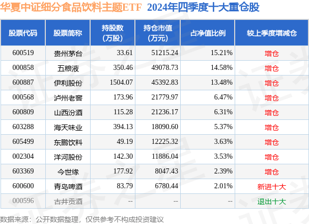 华夏中证细分食品饮料主题ETF为指数型-股票基金,根据最新一期基金季报显示,该基金资产配置:股票占净值比99.8%,无债券类资产,现金占净值比0.43%。基金十大重仓股如下: