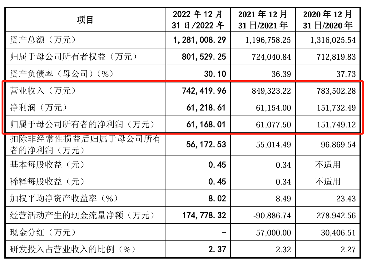 财务方面,新明珠营收和净利整体呈下滑趋势。2020年至2022年(下称“报告期”),公司分别实现营业78.35亿元、84.93亿元、74.24亿元,同比变动-2.83%、8.4%、-12.59%;归母净利润分别为15.17亿元、6.11亿元、6.12亿元,2021年、2022年净利润仅剩2020年的一半。