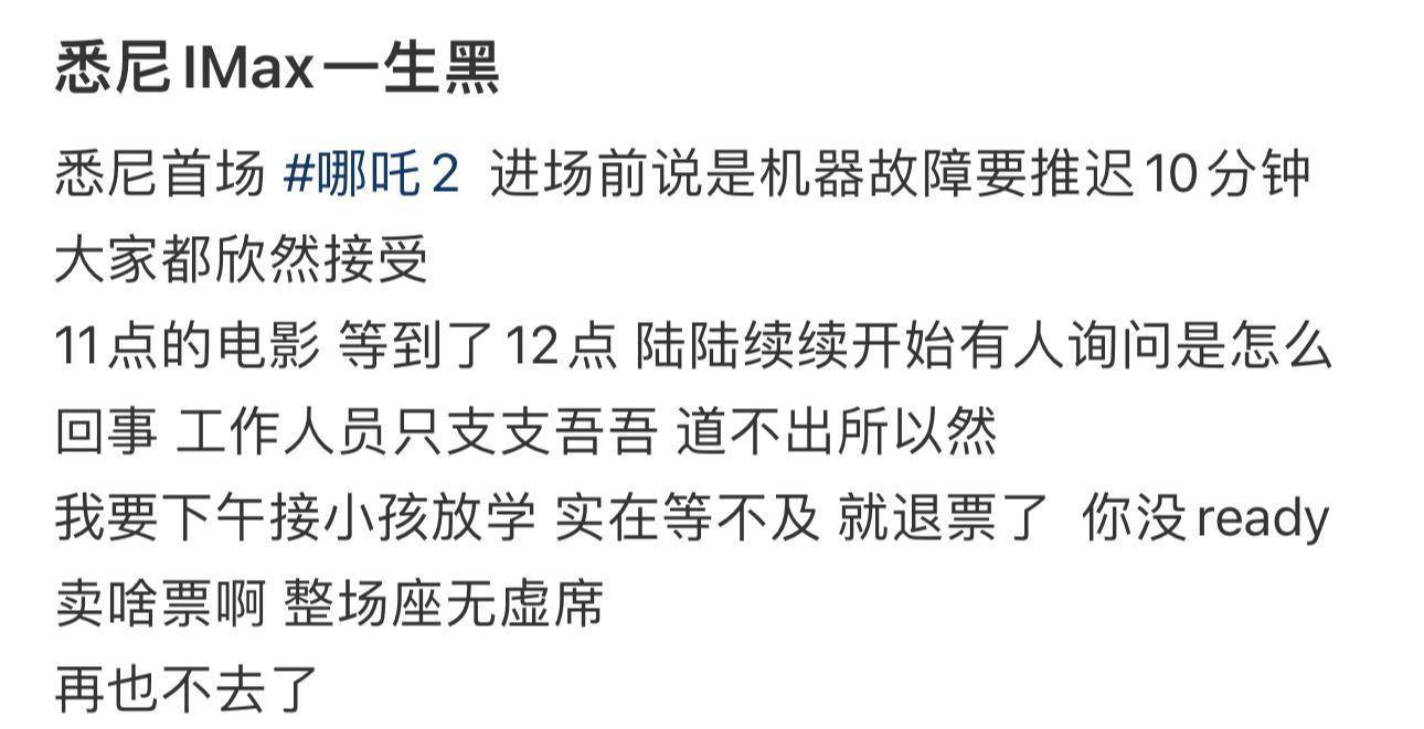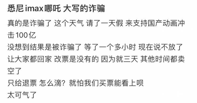 多名购买了该场次的网友也在社交平台描述了类似的状况。“请了一天假来支持国产动画冲击100亿,没想到结果是被诈骗了。”“11点的电影,等到了12点,陆陆续续开始有人询问是怎么回事,工作人员只支支吾吾,道不出所以然。”“《哪吒2》悉尼IMAX首映大乌龙,一小时蓝屏我也看了,出门小雨上车暴雨,打着双闪回家。”