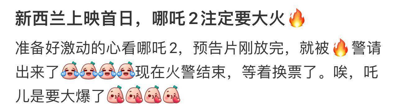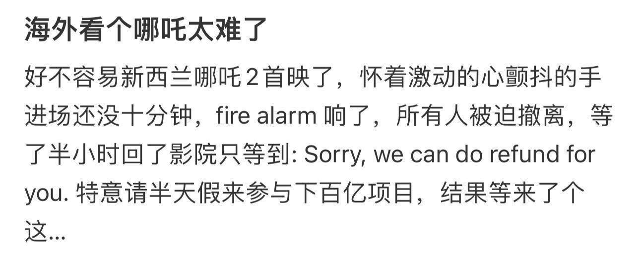 无独有偶,《哪吒之魔童闹海》在新西兰上映首日,惠灵顿一家商场内的影院因为临时突发火警,取消放映原定于下午2点45分的IMAX场次。
