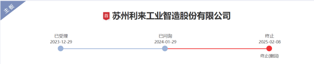 2月8日晚,深交所公布对苏州利来工业智造股份有限公司主板IPO终止审核的决定,直接原因是公司及保荐机构中信证券撤回申报。公司IPO申报于2023年12月29日获得受理,2025年1月3日公布第二轮问询的回复。2024年12月30日公布了最新一版招股书。公司本次申报IPO拟募资10亿元。