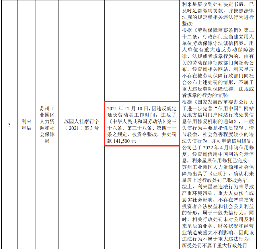 公司披露了报告期内各子公司因14项违法事项合计被罚款45.28万元。很特殊的一项处罚是子公司利来星辰2021年12月10日,因违反规定延长劳动者工作时间,违反了《中华人民共和国劳动法》第三十六条、第三十八条、第四十一条之规定,被苏州工业园区人力资源和社会保障局(苏园人社察罚字﹝2021﹞第3号)处罚:责令整改,并处罚款141500元。