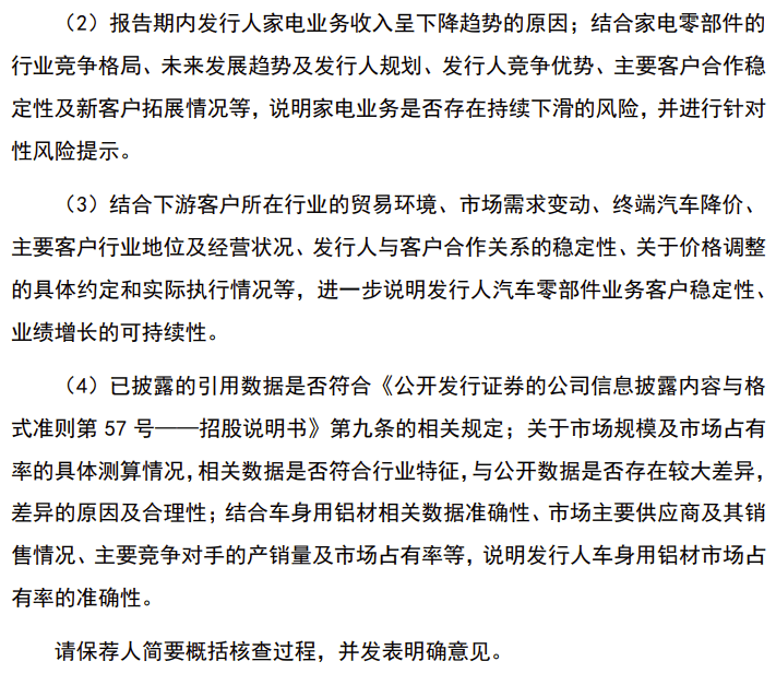 招股书披露:公司业务模式成熟,是行业内同时拥有材料剪切、模具制造、冲压、焊接、装配、表面处理等一体化工艺的龙头企业,产品规格丰富、业务规模较大,系行业内具有代表性的优质企业。根据中国汽车工业协会新材料分会及中国汽车报调研测算,2023年国内汽车车身用铝制剪切件需求量达到41.90万吨,而当年度公司汽车车身用铝制剪切件销量约为6.31万吨,市场占有率达到15.05%。