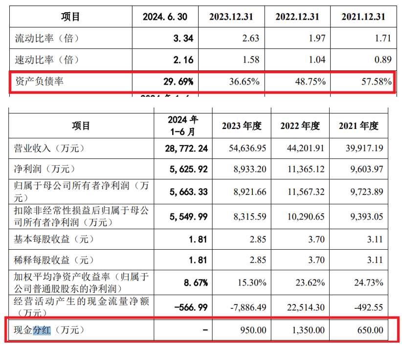 首先,从财务数据来看,矽电股份的资产负债率并不高。报告期内,公司的资产负债率呈现出逐年下降的趋势,2024年前三季度甚至降至30%左右。此外,公司每年还进行现金分红,累计分红金额近3000万元。据悉,此次矽电股份拟募集资金总额为5.56亿元,其中1.6亿元用于补充流动资金,占募资总额约28.78%。