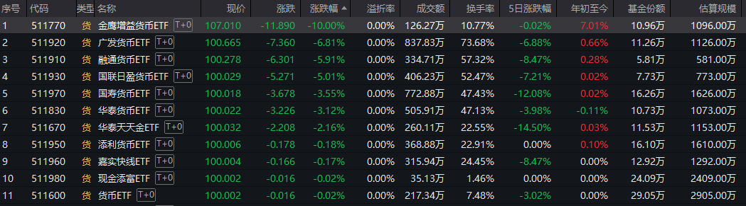 值得一提的是,2月10日、11日,上述货币ETF接连出现大幅上涨,金鹰增益货币ETF两日累计涨幅达18.08%,广发货币ETF、融通货币ETF累计涨幅均超过6%。此外,国联日盈货币ETF、国寿货币ETF、华泰天天金ETF均有不同程度上涨。