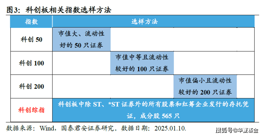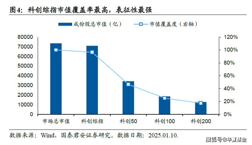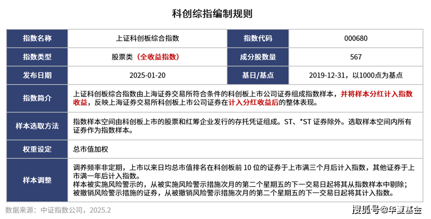 作为科创板首只覆盖全市场的综合指数,科创综指选取科创板上市满一年的全部非ST、 *ST股票,采用总市值加权方式,其代表性类似于上证指数之于上交所、纳斯达克指数之于纳斯达克交易所。