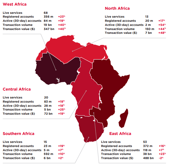 移动货币作为目前非洲最主要也是增长最快的数字支付形式。根据 GSMA《The State Of The Industry Report On Mobil Money》报告,2023 年,非洲移动货币注册账户数达到 8.56 亿,占全球注册账户的 49%,新增注册账户 1.36 亿,占全球注册账户总增长的 70% 以上,已经是全球移动货币最主要的增长源头。目前非洲拥有大约 169 种移动货币服务,包括 M-PESA、Airtel Money、Orange Money、MTN Mobile Money、Ecocash 和 Tigo Pesa 等,这些平台允许用户使用手机存钱、汇款和收款,为传统银行业务提供了一种便捷的替代方案,尤其是在银行基础设施有限的地区。除了改善金融包容性和获得其他数字化服务之外,移动货币的采用、使用和增长也推动了非洲宏观经济的增长。移动货币对撒哈拉以南非洲地区的 GDP 增长贡献超过 1500 亿美元,贡献率达到 3.7%。对东非地区的 GDP 增长贡献率则达到 5.9%。