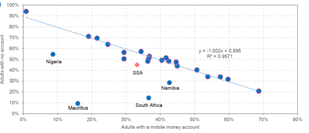 从以下统计数据中也能看出,随着手机的使用率在非洲的提升,在各国,拥有移动货币账户的成年人与从未拥有金融账户的成年人比例成明显负相关,说明,拥有移动货币账户比例更高的国家展现出更高的金融包容性。