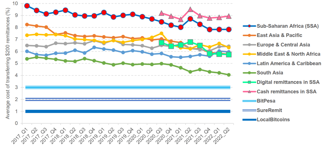 过去几十年,汇入非洲大陆的资金持续增长,但非洲百姓依旧受到汇款成本过高的困扰,根据联合国发展计划署的统计,2022 年 2 季度,非洲地区汇款 200 美元的成本高达 7.8%,远高于全球其他地区的平均成本 4%-6.4%。使用加密货币进行汇款可以大幅降低汇款成本(甚至低至传统汇款方式的二十分之一),以尼日利亚的 SureRemit 为例,针对汇款收取 0%-2% 的费用。此外,使用稳定币进行汇款,也能避免潜在资产价格波动带来的损失。Paxful,BuyCoins,Luno,Quidax 等非洲主流交易平台在过去一段时间均出现了大量出于汇款目的的稳定币交易需求。