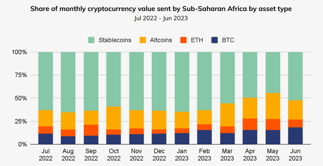 2023 年撒哈拉以南非洲国家加密货币月交易量按资产分类图