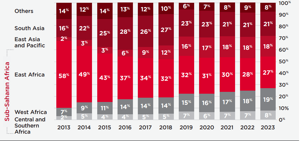 非洲的数字经济呈现出较大的地区差异与分化,2023 年整个非洲大陆移动货币账户共有 8.56 亿个,交易额达到 9190 亿美元,其中,东非和西非在移动货币的发展上走在前列,两者活跃账户数占到全非洲的 85%,交易额占到 90.8%。从活跃账户数据来看,早期,东非国家基础较好,西非国家过去 10 年发展最快,增长最快。