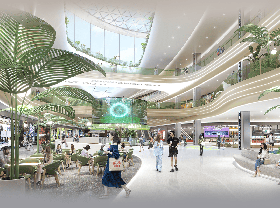流线错层与三大中庭是湾里·王府井WellTown最重要的设计亮点,以“自然、未来”为主题,充分利用退台与屋顶花园打造立体商业空间。