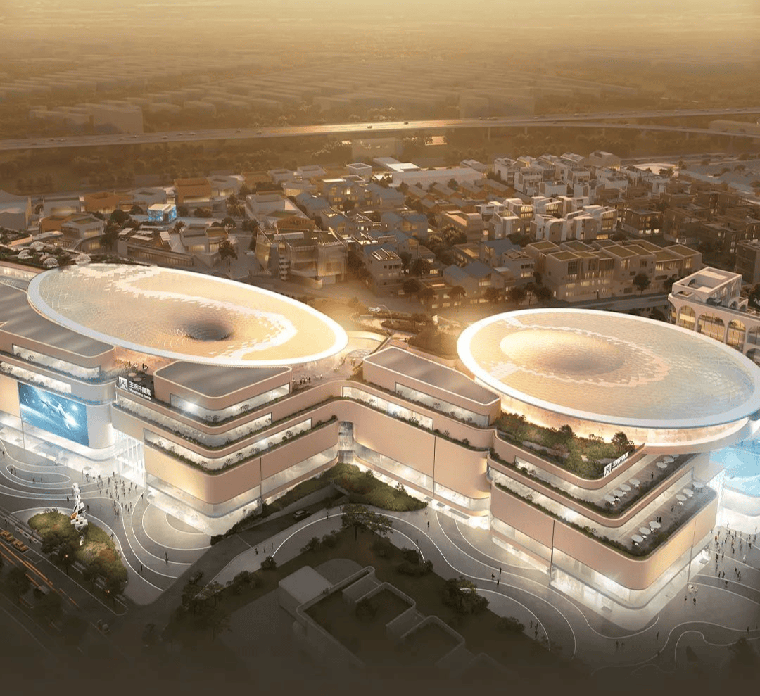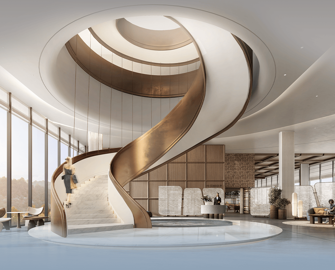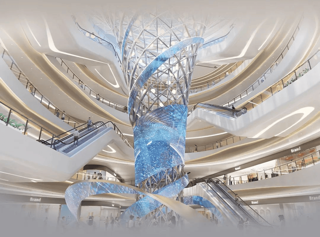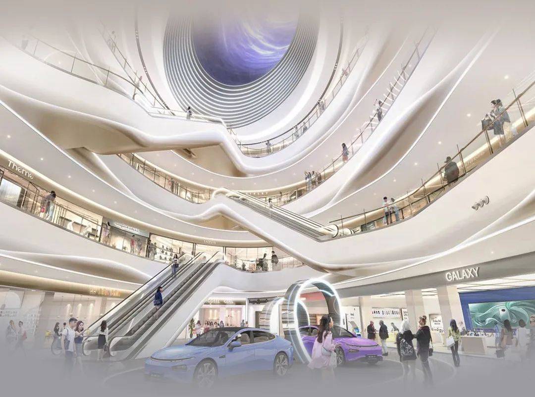 从效果图上看,商场内部如花朵般“绽放”的穹顶璀璨夺目,光之境、水之境与洞之境三大中庭对应银河、瀑布、花园要素,让商业建筑与自然生态进一步融合统一,30米高的瀑布从中庭倾泻而下,水幕与自然光相映成趣,为商场增添了满满的艺术感。