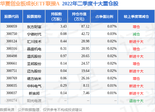 华夏创业板成长ETF联接A为指数型-股票基金,根据最新一期基金季报显示,该基金资产配置:无股票类资产,无债券类资产,现金占净值比6.14%。基金十大重仓股如下: