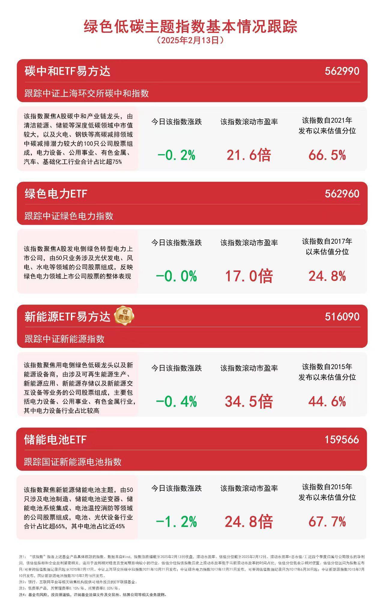 绿色低碳主题指数早间冲高后反复震荡,尾盘下行。截至收盘,中证绿色电力指数下跌0.02%,中证上海环交所碳中和指数下跌0.2%,中证新能源指数下跌0.4%,国证新能源电池指数下跌1.2%。