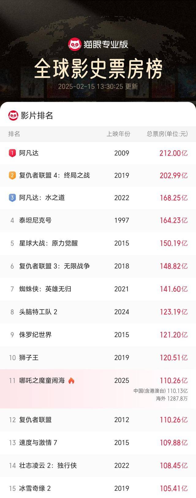 成为首部进入全球票房榜前11亚洲电影!