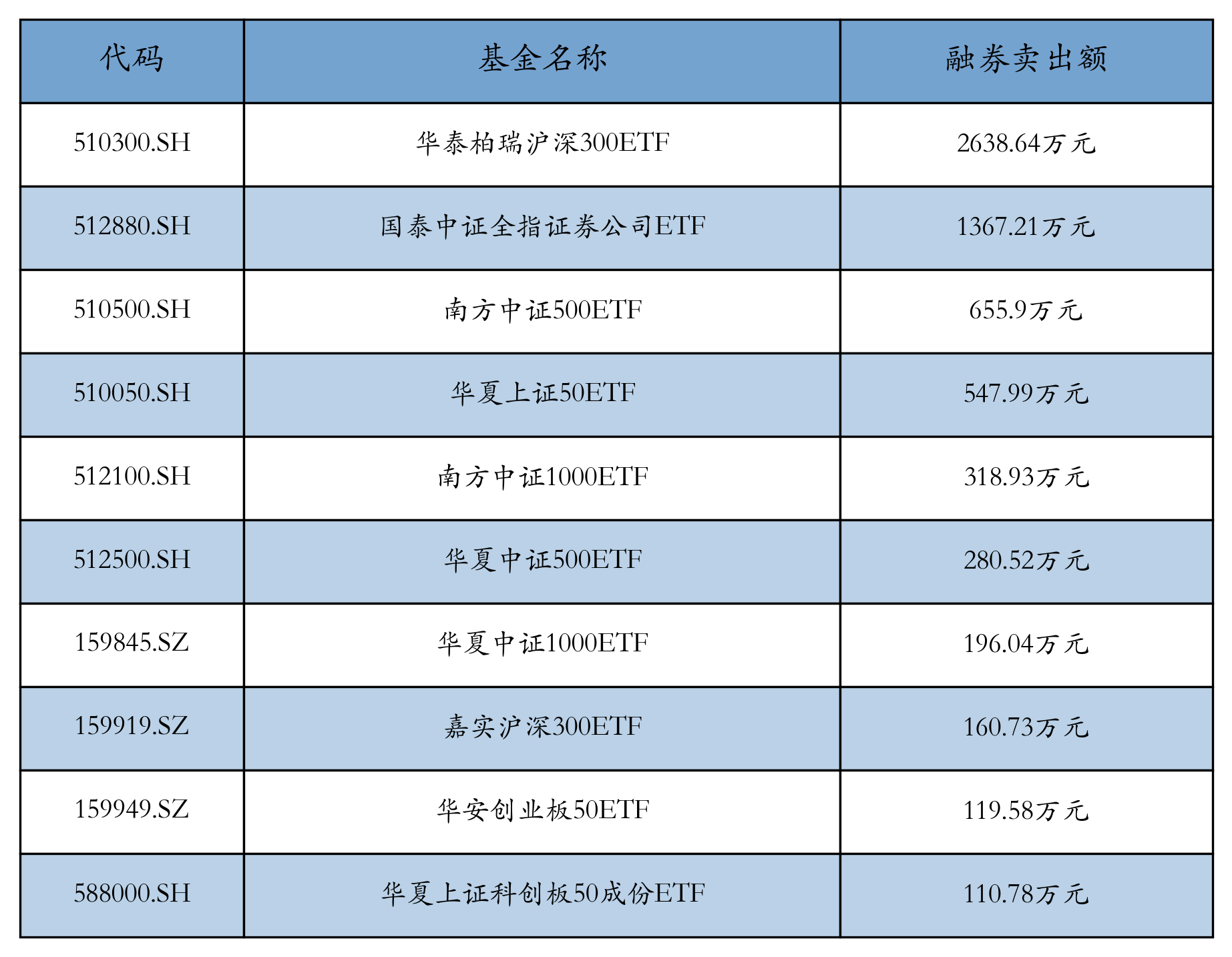 2月14日ETF融券卖出额前三位分别为:华泰柏瑞沪深300ETF(2638.64万元)、国泰中证全指证券公司ETF(1367.21万元)和南方中证500ETF(655.9万元),前10具体见下表: