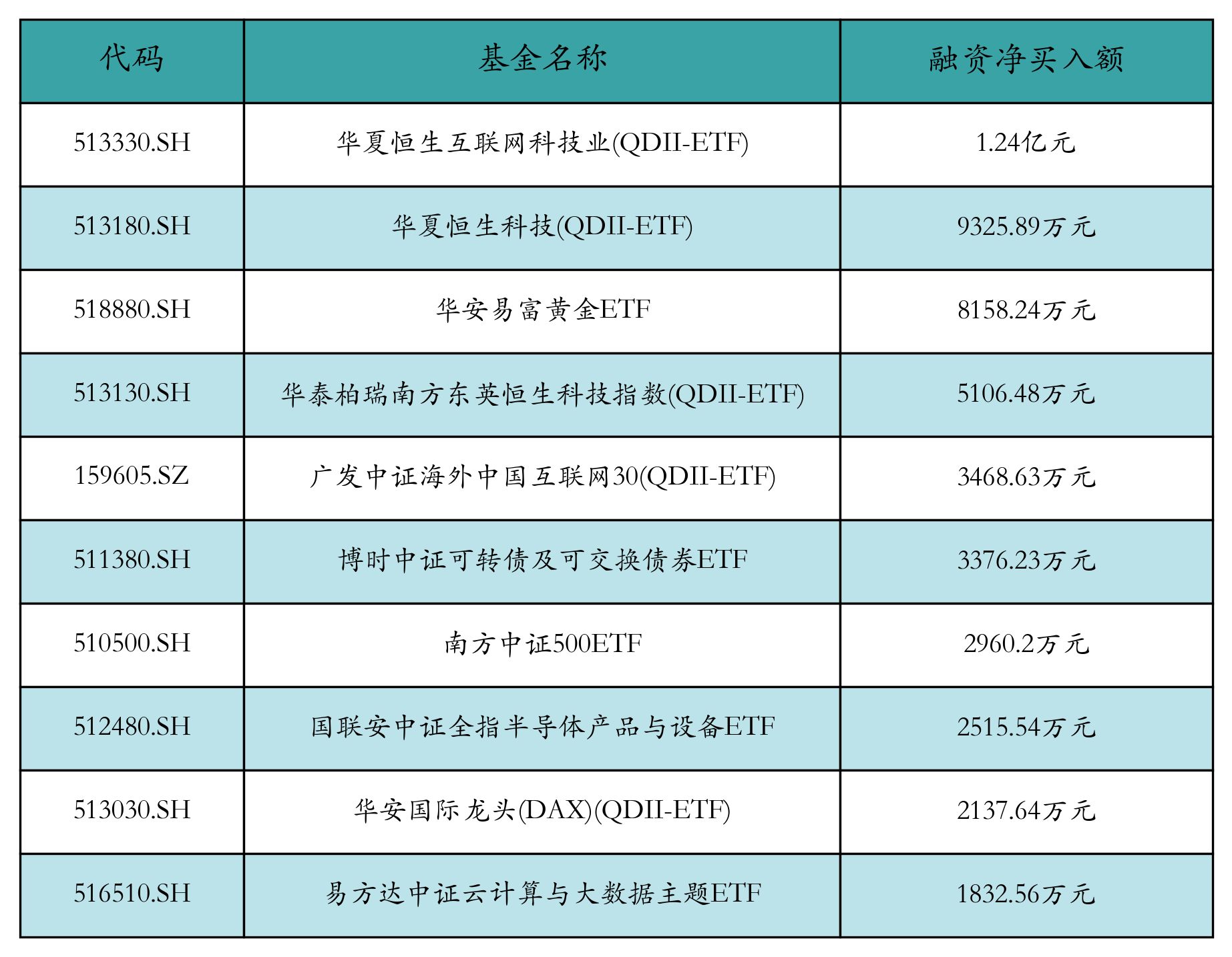 2月14日ETF融资净买入额前三位分别为:华夏恒生互联网科技业(QDII-ETF)(1.24亿元)、华夏恒生科技(QDII-ETF)(9325.89万元)和华安易富黄金ETF(8158.24万元),前10具体见下表: