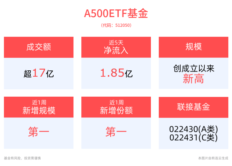 份额方面,A500ETF基金近1周份额增长2.70亿份,实现显著增长,新增份额位居可比基金1/29。