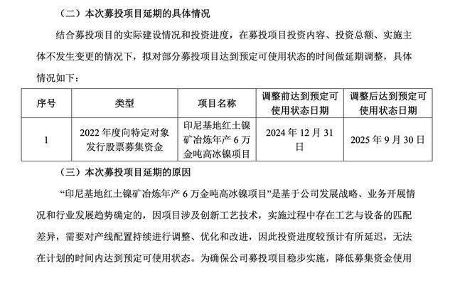 另外,中伟股份在印尼的年产6万金吨红土镍矿冶炼高冰镍项目也被延期。其解释称,因项目涉及创新工艺技术,实施过程中存在工艺与设备的匹配差异,需要对产线配置持续进行调整、优化和改进,因此投资进度较预计有所延迟,无法在计划的时间内达到预定可使用状态。