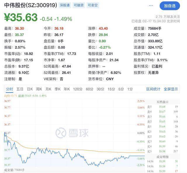 截至2月17日收盘,中伟股份报35.63元,跌1.49%,总市值约333.89亿元。