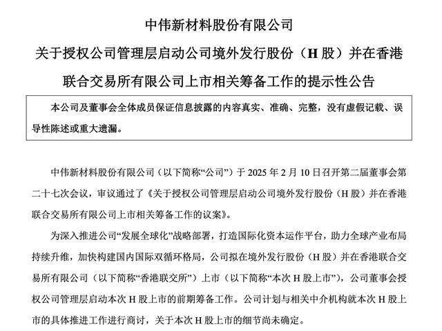 瑞财经 吴文婷 近日,中伟股份发布公告称,公司于2025年2月10日召开第二届董事会第二十七次会议,审议通过了《关于授权公司管理层启动公司境外发行股份(H股)并在香港联合交易所有限公司上市相关筹备工作的议案》。