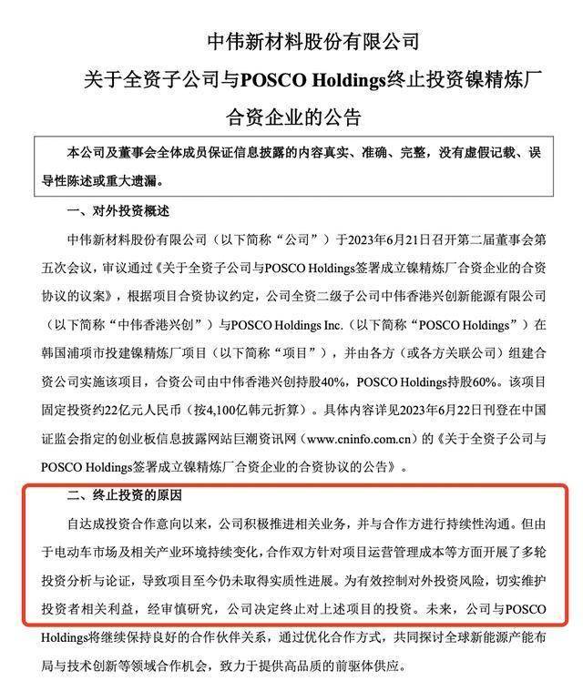 2月11日,中伟股份公告称,由于电动车市场及相关产业环境持续变化,导致项目至今仍未取得实质性进展,为有效控制对外投资风险,决定终止与POSCO Holdings Inc.在韩国投建镍精炼厂项目。