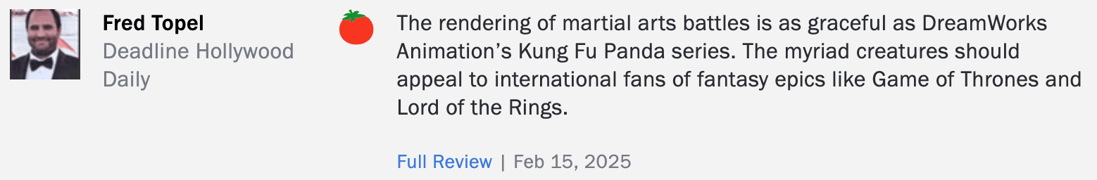 记者17日查看国际知名影评网站“烂番茄”发现,有来自Deadline Hollywood Daily的专业影评人对《哪吒2》进行了评价。该影评人表示,《哪吒2》对武打场面的渲染,与梦工厂动画片《功夫熊猫》系列电影一样优美。影片中各式各样的生物,应该会吸引喜欢《权力的游戏》和《指环王》等奇幻史诗电影的国际粉丝。