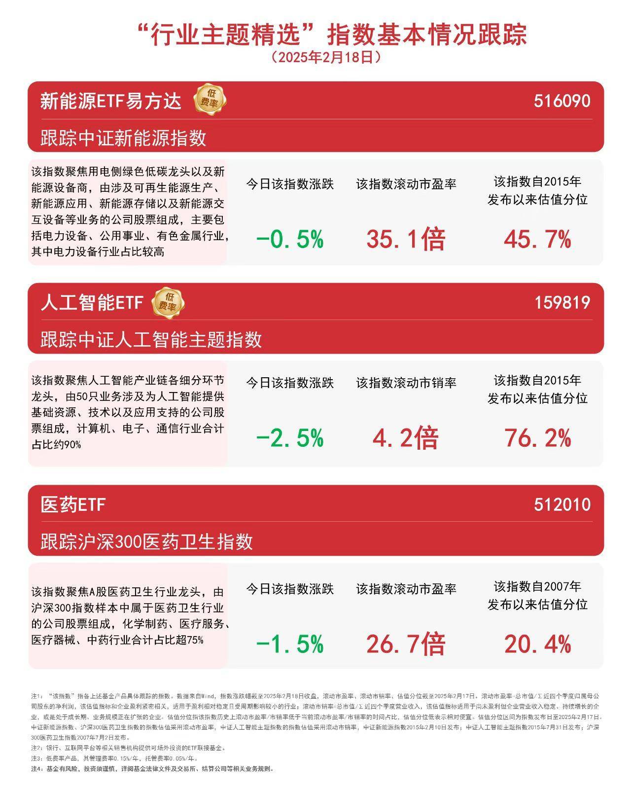 截至收盘,中证新能源指数下跌0.5%,沪深300医药卫生指数下跌1.5%,中证人工智能主题指数下跌2.5%。