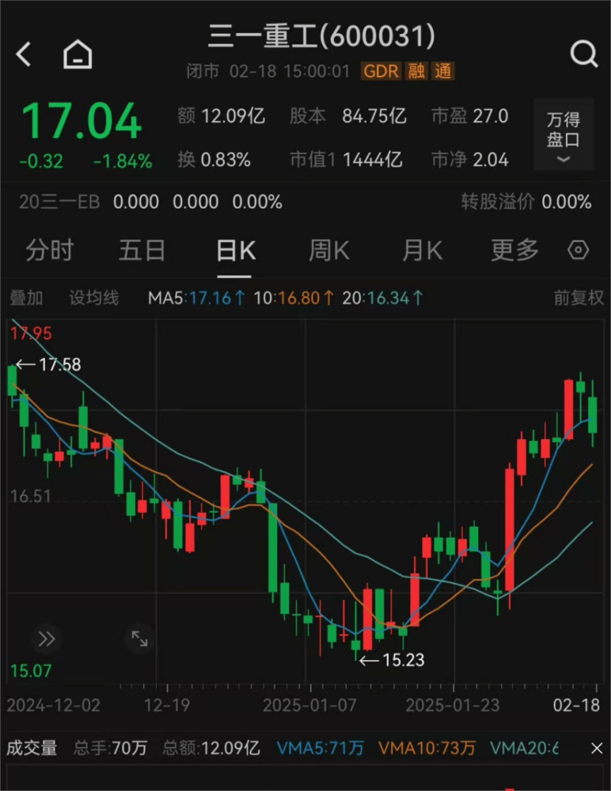 截至2月18日收盘,三一重工每股报17.04元,最新市值为1444亿元。