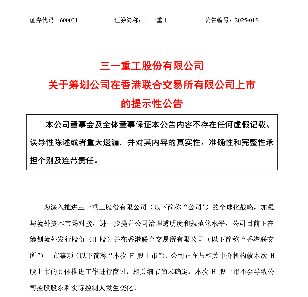 2月18日,三一重工发布公告称,为深入推进公司的全球化战略,加强与境外资本市场对接,进一步提升公司治理透明度和规范化水平,公司目前正在筹划境外发行股份(H股)并在香港联合交易所有限公司上市事项。
