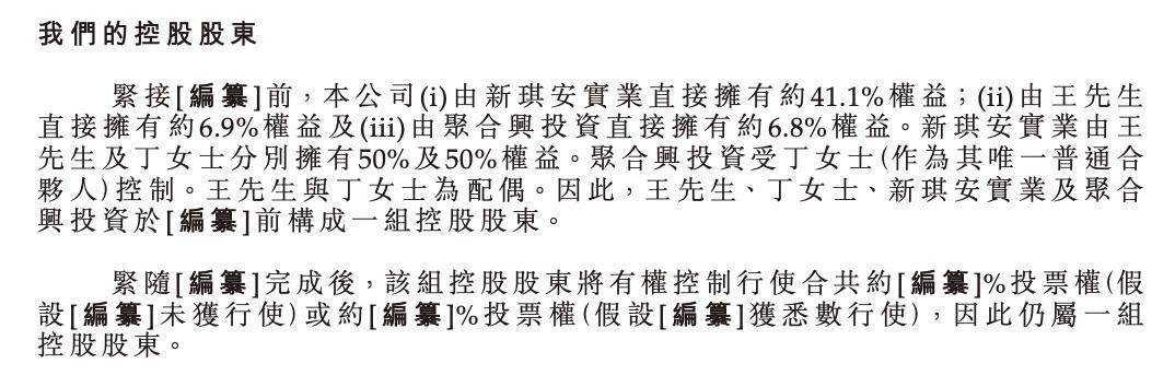 本次IPO前,新琪安由新琪安实业直接拥有约41.1%权益;由王小强直接拥有约6.9%权益及由聚合兴投资直接拥有约6.8%权益。新琪安实业由王小强及丁丹分别拥有50%及50%权益。聚合兴投资受丁丹(作为其唯一普通合伙人)控制。王小强与丁丹为配偶。因此,王小强、丁丹、新琪安实业及聚合兴投资构成一组控股股东,合计持股约54.8%。而丁丹未在公司任职。